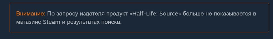 Если открыть страницу Half Life Source по ссылке, то можно найти уведомление: «По запросу издателя продукт "Half-Life: Source" больше не показывается в магазине Steam и результатах поиска».