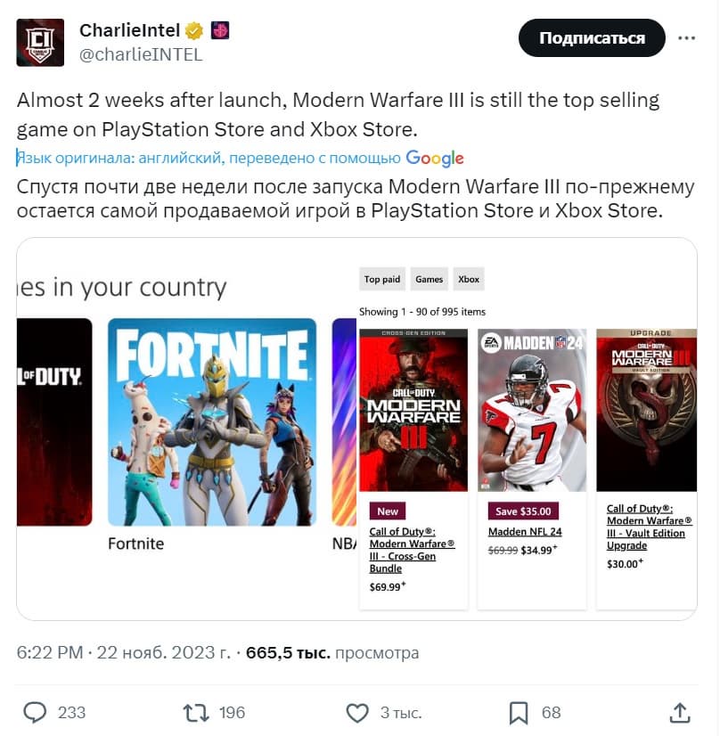 Релиз Call of Duty: Modern Warfare 3 состоялся 10 ноября. Игра пользуется популярностью, но даже в этой ситуации сеть Walmart подготовила специальное предложение для покупателей Walmart+ - желающие смогут приобрести шутер за 60 долларов для PS4, PS5 и Xbox. Также известно, что акция стартовала на Amazon.