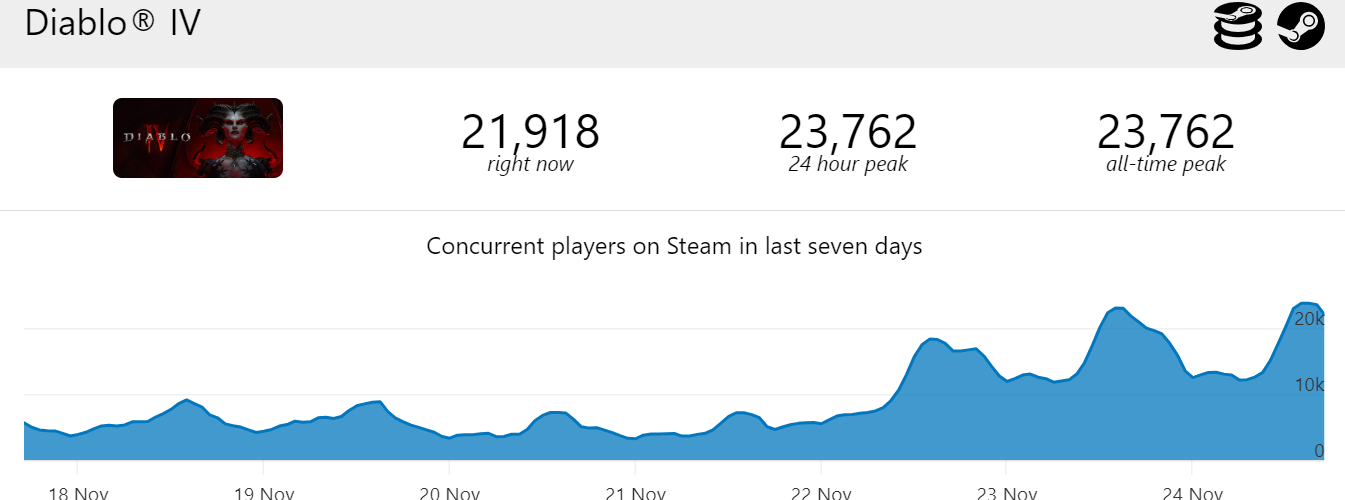 Пиковый онлайн Diablo 4 в Steam превысил 23 тысячи.