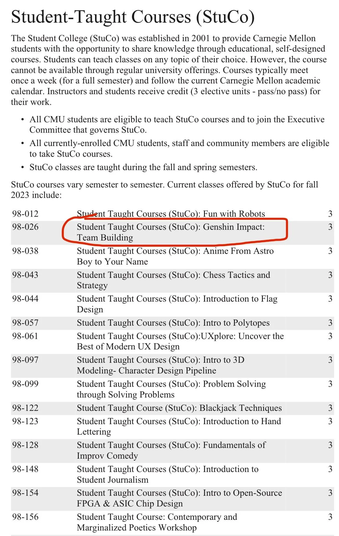 В центре внимания оказался Carnegie Mellon University. В списке доступных курсов были замечены «Student Taught Courses (StuCo): Genshin Impact - Theorycrafting 101» и «Team Building».