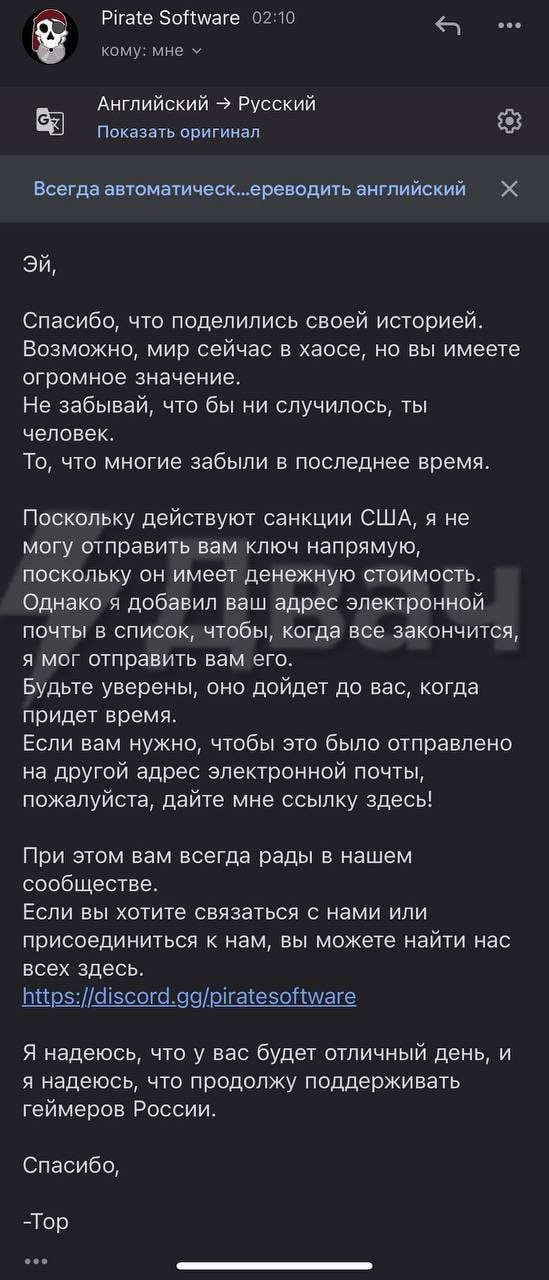 Похоже, что история получила несколько неожиданное продолжение. В сети стали распространять следующее фото: как утверждается, разработчик стал отвечать на запросы ключа лишь обещанием подарка — сейчас из-за санкций США он не может отправить ключ напрямую, поскольку он имеет денежную стоимость. Ключ отправит когда-нибудь потом.