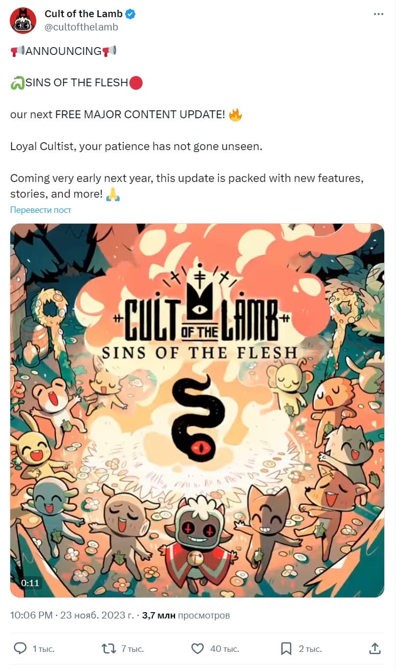 Разработчики Massive Monster объявили, что одна из самых популярных инди-игр последних лет Cult of the Lamb вскоре получит дополнение с тревожным названием Sins of the Flesh.