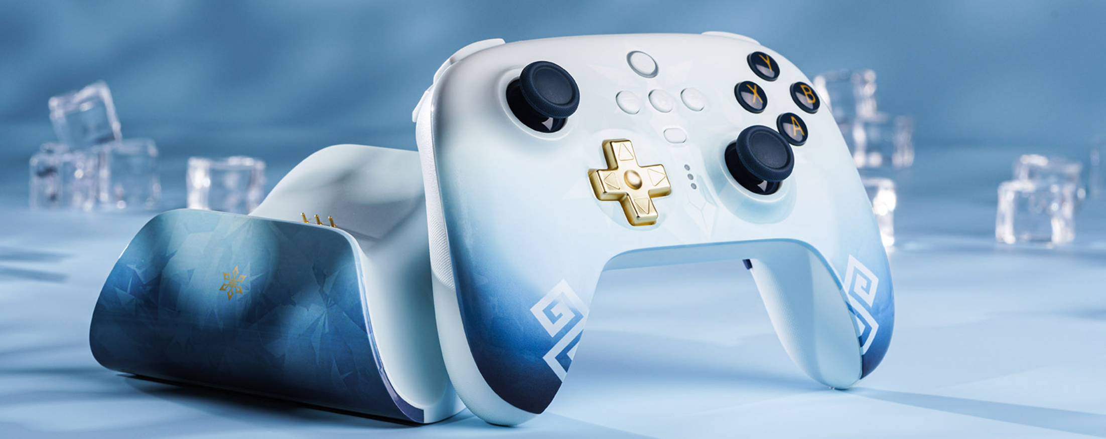 Устройство выполнено в стиле одно из героев Genshin Impact. Чун Юнь (4 звезды редкости, крио) стал источником вдохновения для создателей геймпада.