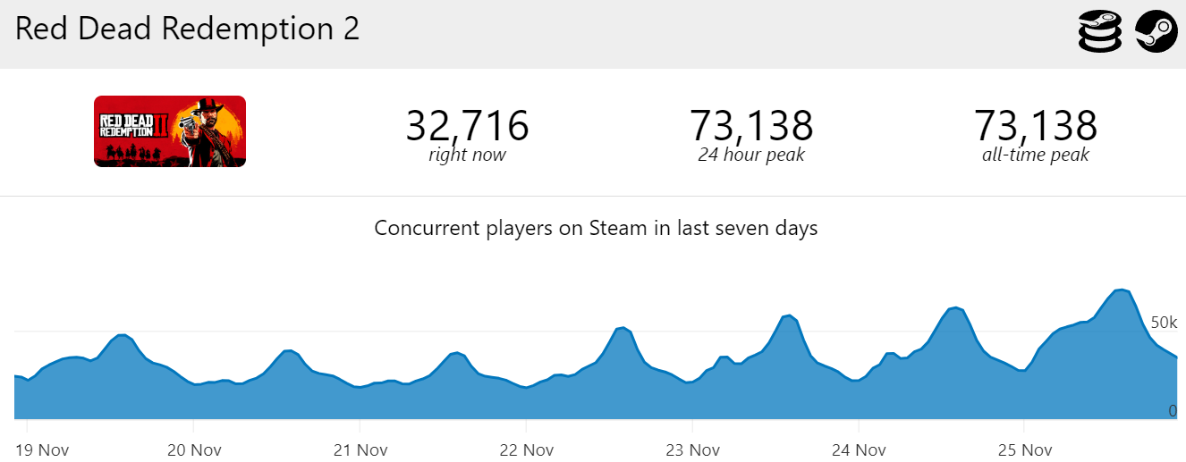Судя по данным SteamDB, последний раз пиковый онлайн Red Dead Redemption 2 в Steam превышал 70 тысяч игроков в январе 2023 года.