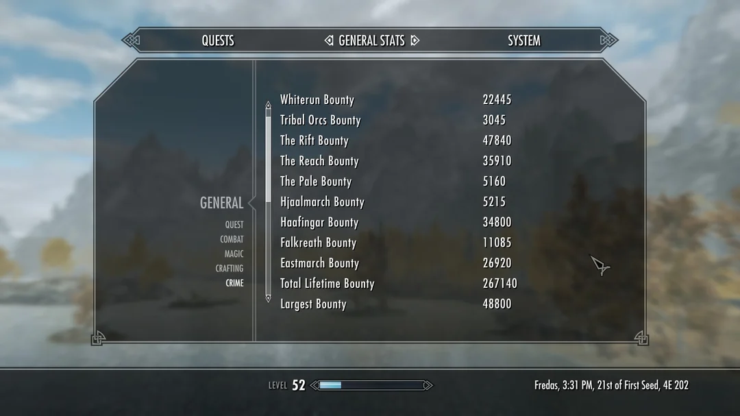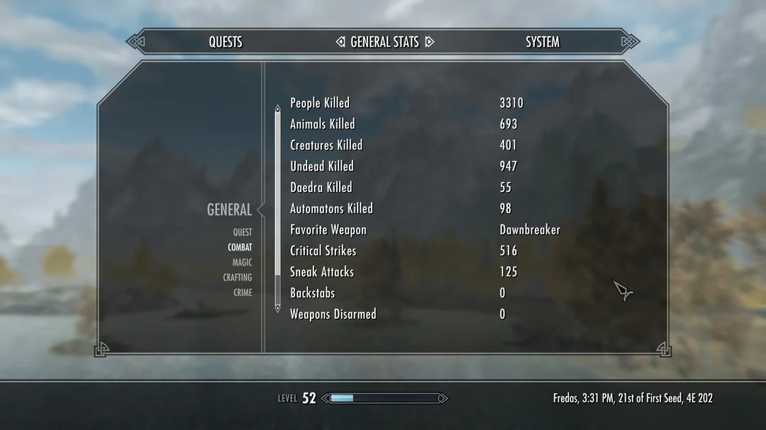 Увлечённый геймер поделился статистикой: убито 3310 людей, животных — 693, нежити — 947, существ — 401, даэдров — 55, автоматонов — 98. При этом счётчик ударов в спину (backstabs) на нуле. Общая награда за голову составляет 267 140 золотых.