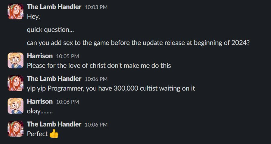 Судя по опубликованной переписке, начинается работа над секс-обновлением Cult of the Lamb.