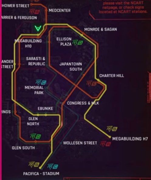 Метро в Cyberpunk 2077 будет состоять из 5 линий и 19 станций (можно наблюдать поездку или промотать; будет опция быстрого перемещения):