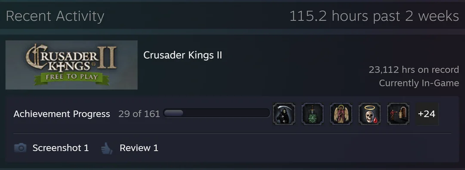krunnky рассказал, что его отец провёл в Crusader Kings 2 (2012) в Steam более 23 тысяч часов. При этом это не совсем настоящее игровое время.