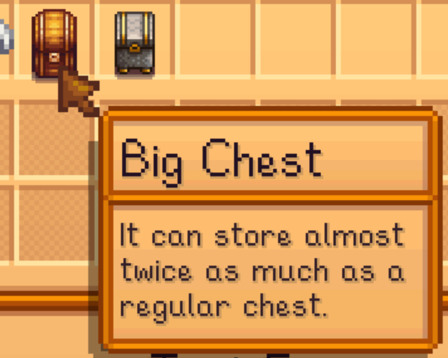 Большую часть контента Stardew Valley 1.6 он держит в секрете, но кое-что готов показать. Судя по тизеру, Большой Сундук (Big Chest) вдвое вместительнее, чем обычный.