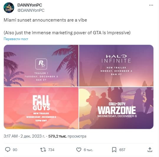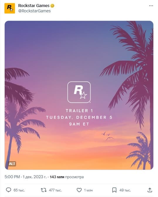 Анонс от Rockstar мгновенно набрал абсурдно высокий охват на Twitter – на момент публикации заметки более 143 миллионов показов. Только создатели GTA могут собрать такие огромные цифры.