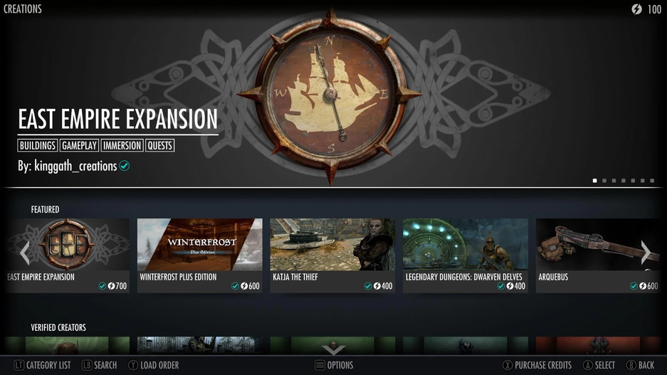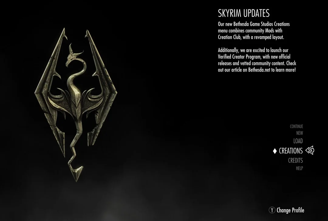 Также не забывают про моды: всё объединили в раздел Creations (Mods + Creation Club). Прямо в игре представлен магазин с бесплатными, а также платными модами, продающимися за премиальную валюту — сообщество не в восторге от этого, цены иногда внушительные (например, отмечают оружие за ~6 евро). Дополнительным поводом для недовольства послужила поломка некоторых модов из-за обновления Skyrim.