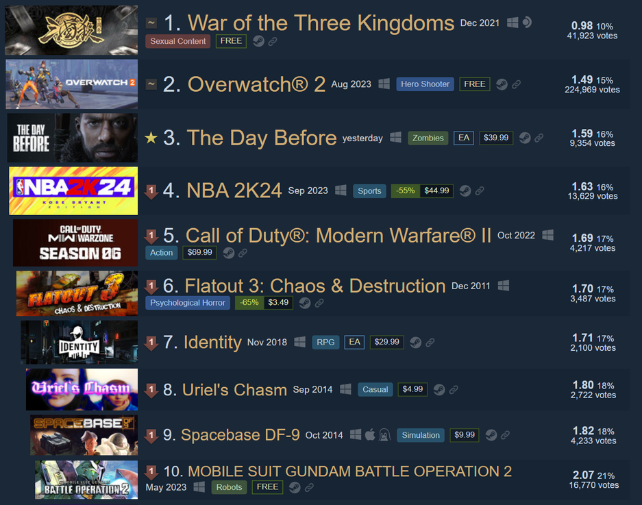 The Day Before получила 10+ тысяч обзоров в Steam, из которых 80+% отрицательные. Игра ворвалась в тройку худших в истории Steam, сейчас она конкурирует с Overwatch 2 от Blizzard.