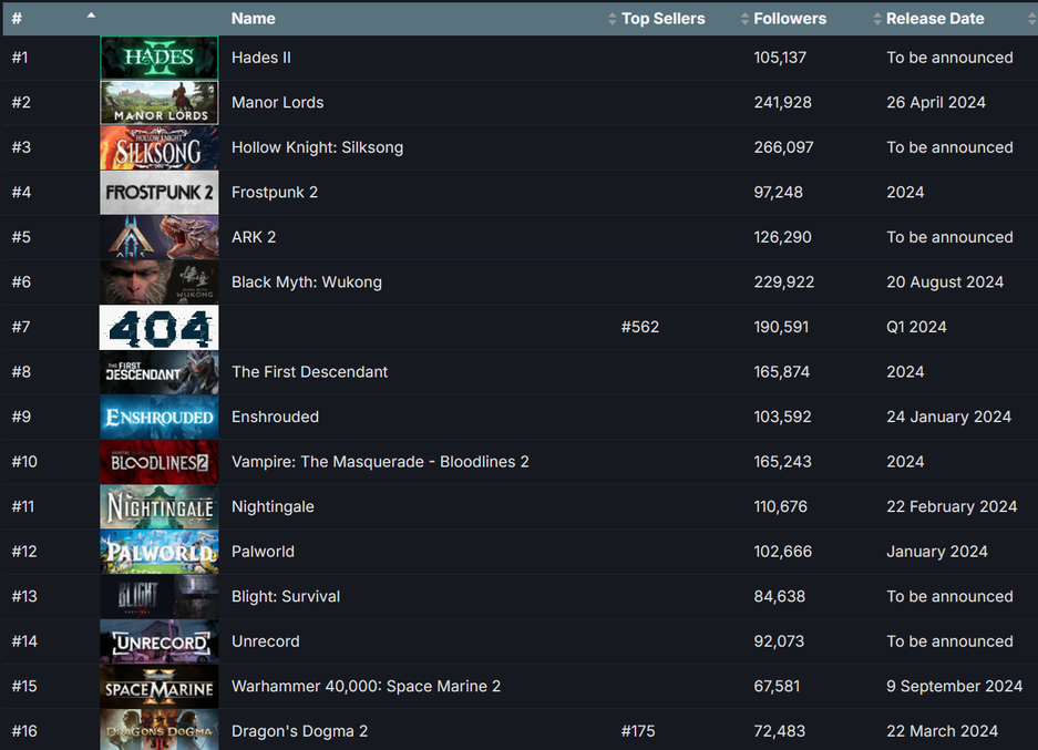 Теперь самая желанная (ожидаемая) игра в Steam это Hades 2. Запуск раннего доступа ожидается во втором квартале 2024 года. На втором месте стратегия Manor Lords, а тройку лидеров замыкает Hollow Knight Silksong.