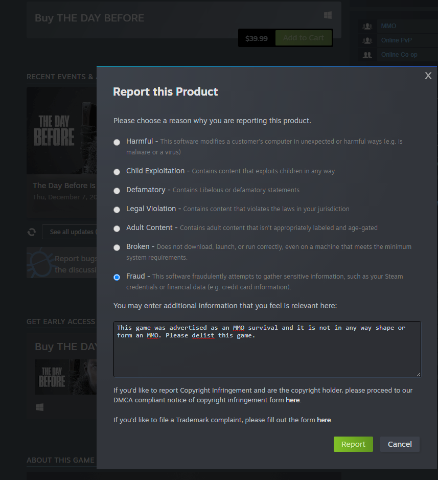 Некоторые поигравшие в The Day Before настолько взбесились, что начали кампанию по удалению игры из Steam: оформляют запрос на возврат средств и пишут Valve, что разработчики из Fntastic ввели их в заблуждение (используют ложную рекламу) и следует убрать такую игру из Steam.