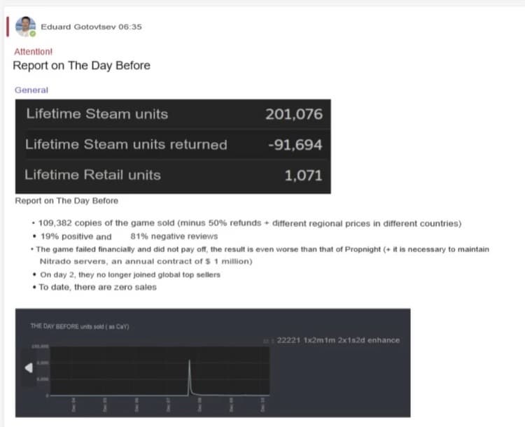 Он поведал, что с момента запуска The Day Before удалось продать около 109 тысяч копий. Хотя фактические продажи достигли 200 тысяч копий, половина из них была возвращена и не учтена в конечной цели Fntastic.