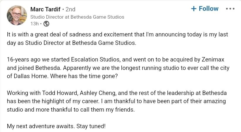 В 2023 году команду Bethesda Game Studios покидает ещё один менеджер, Марк Тардиф отправляется на поиски новых приключений