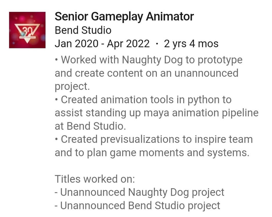 Об этом рассказал информатор Faizan Shaikh, указав, что старший геймплейный аниматор Адам Лоусон уже более 2 лет и 4 месяцев работает с Naughty Dog над прототипом секретной игры.