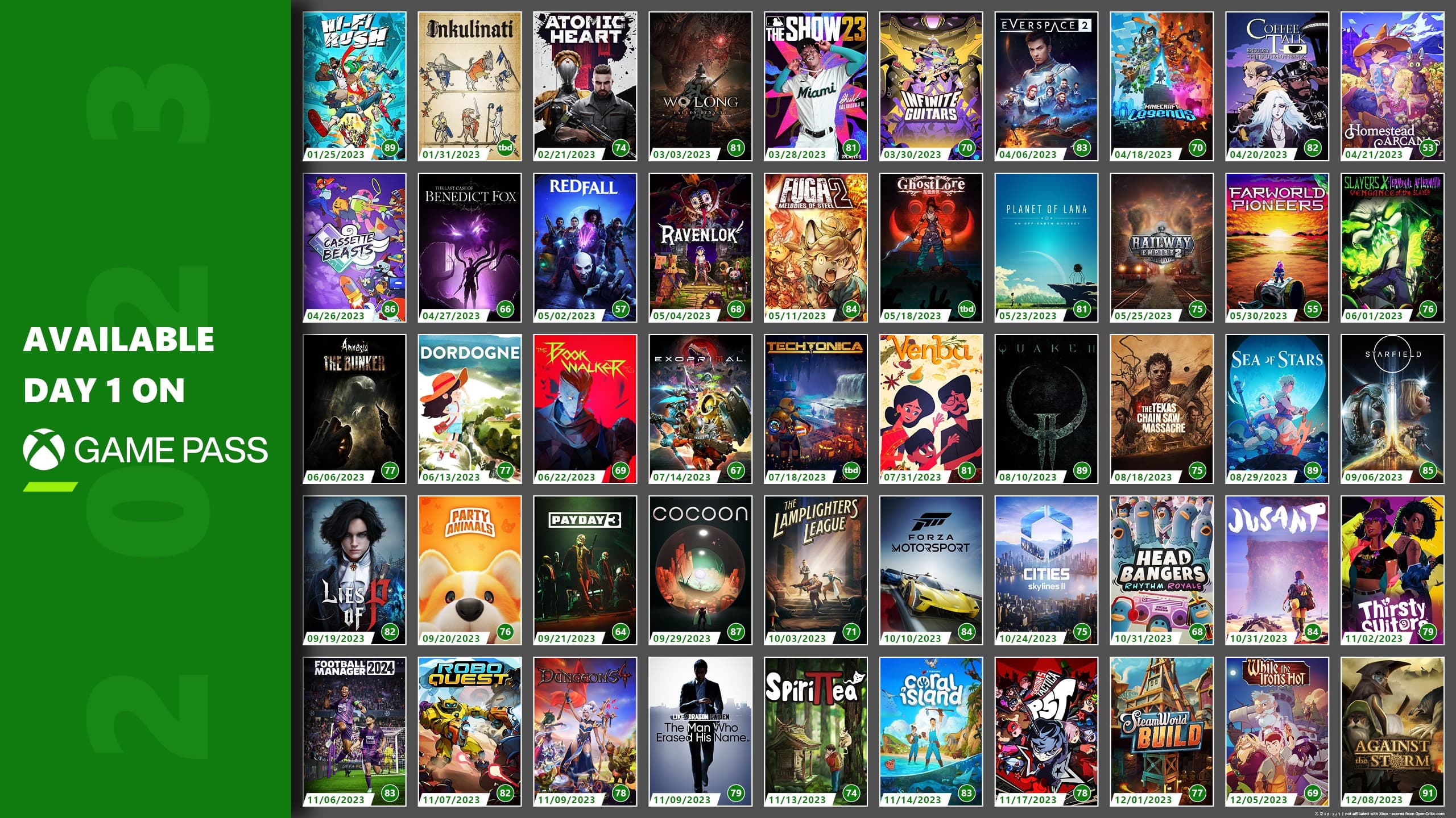 В текущем году игроки получили возможность поиграть в следующие ААА-продукты: Wo Long: Fallen Dynasty, Redfall, Minecraft Legends, Atomic Heart, Starfield, Lies of P, Payday 3, Forza Motorsport, Football Manager 2024, Exoprimal, Persona 5 Tactica и Like a Dragon Gaiden: The Man Who Erased His Name. Также не стоит забывать о более мелких, но не менее значимых проектах, как Sea of Stars, Planet of Lana, Cocoon, Jusant и Spirittea.
