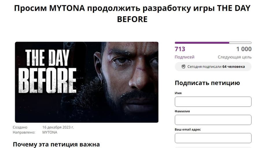 На Change.org появилась петиция с просьбой продолжить разработку «выживача» The Day Before, адресованная издателю игры MYTONA.