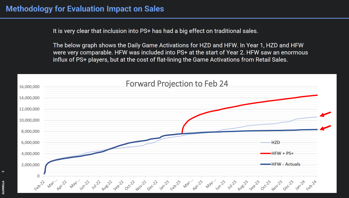 Sony пришла к выводу, что подписочная модель оказывает серьёзное влияние на «традиционные продажи» (не в лучшую для издателя сторону): с включением Horizon Forbidden West в подписку PS Plus на графике наблюдается всплеск активности игроков, вот только продажи почти перестали расти.