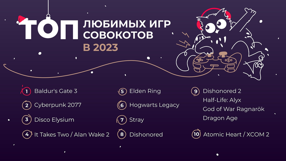 Оказалось, что список любимых игр в 2023 году возглавила Baldur’s Gate 3, следом идёт Cyberpunk 2077, а тройку лидеров замыкает Disco Elysium. На некоторых позициях расположили сразу несколько игр. Starfield в списке не наблюдается.