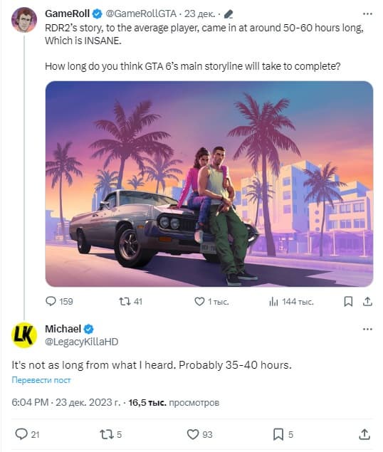 В комментариях в сообщении в Twitter звучат голоса тех, кто разочарован, так как 35-40 часов сюжета за 8 лет разработки – это мало. Важно отметить, что пока это всего лишь слухи. GTA 6 вполне может быть длиннее 40 часов, но пока Rockstar ничего не подтверждала.