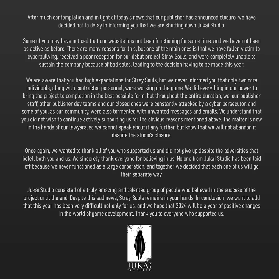 В результате студию Jukai Studio, создавшую Stray Souls, решили закрыть. В заявлении разработчики упомянули о травле в сети и плохих продажах (судя по тексту, решили разобраться с обидчиками и обратились к юристу).