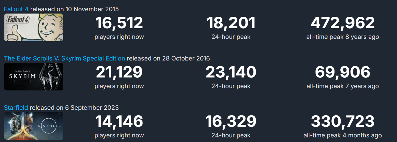 В последнее время пиковый онлайн в пределах 14-20 тысяч, Starfield в этом плане уступает The Elder Scrolls V Skyrim Special Edition и Fallout 4.