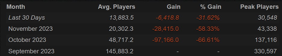 Оказалось, что Starfield растеряла более 90% игроков. В октябре зарегистрировали пик 137 тысяч, в ноябре уже 43 тыс., а за последние 30 дней пик чуть больше 30.5 тыс. (а в среднем 13.8 тыс. игроков).