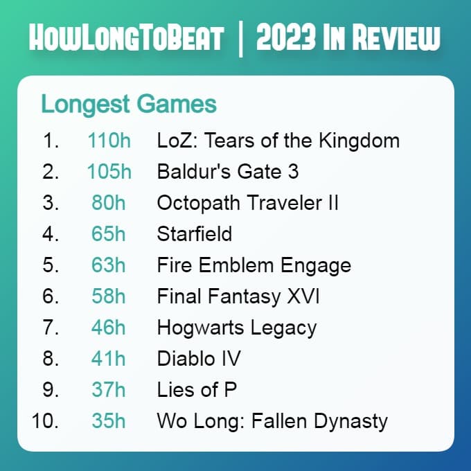 В список, составленный порталом HowLongToBeat, также попали Final Fantasy 16, Starfield, Hogwarts Legacy, Diablo 4 и другие игры.