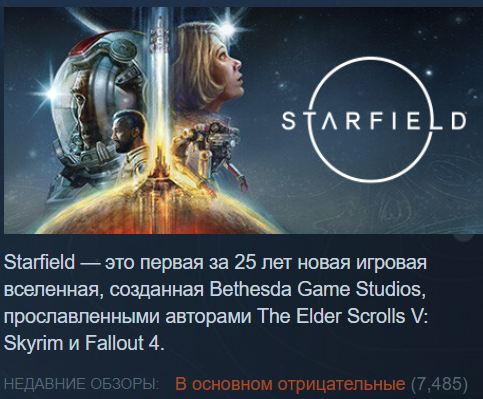 За последние 30 дней у Starfield в основном отрицательные отзывы Steam, более 60% авторов обзоров остались недовольны новинкой Bethesda. Онлайн тоже опускается, уже уступая долгоиграющим The Elder Scrolls V Skyrim Special Edition и Fallout 4.
