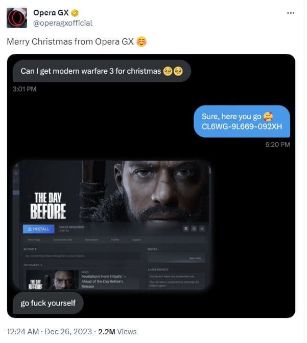 Один из пользователей сети решил попросить у аккаунта Opera GX подарить ему на Рождество Call of Duty: Modern Warfare 3, но получил вместо этого ключ на The Day Before. Подарок очень разозлил игрока, а его реакция весьма развеселила администратора учетной записи геймерского браузера в социальной сети X (когда-то Twitter), решившего поделиться скриншотом переписки с недовольным получателем гостинца:
