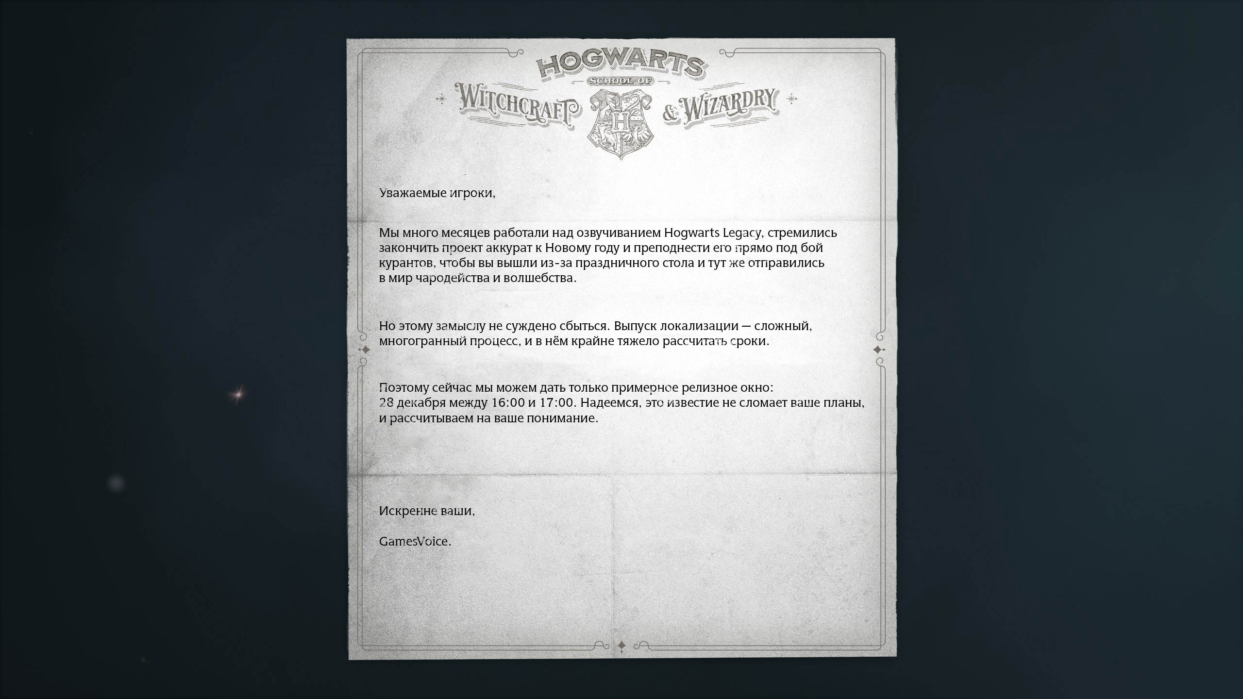 GamesVoice обратилась к сообществу, напомнила о русской озвучке Hogwarts Legacy, сбор на которую удалось закрыть за 10 дней (при целевой сумме 1.9 миллиона рублей). Предполагалось, что долгожданным релизом порадуют под бой курантов, но всё переиграли.