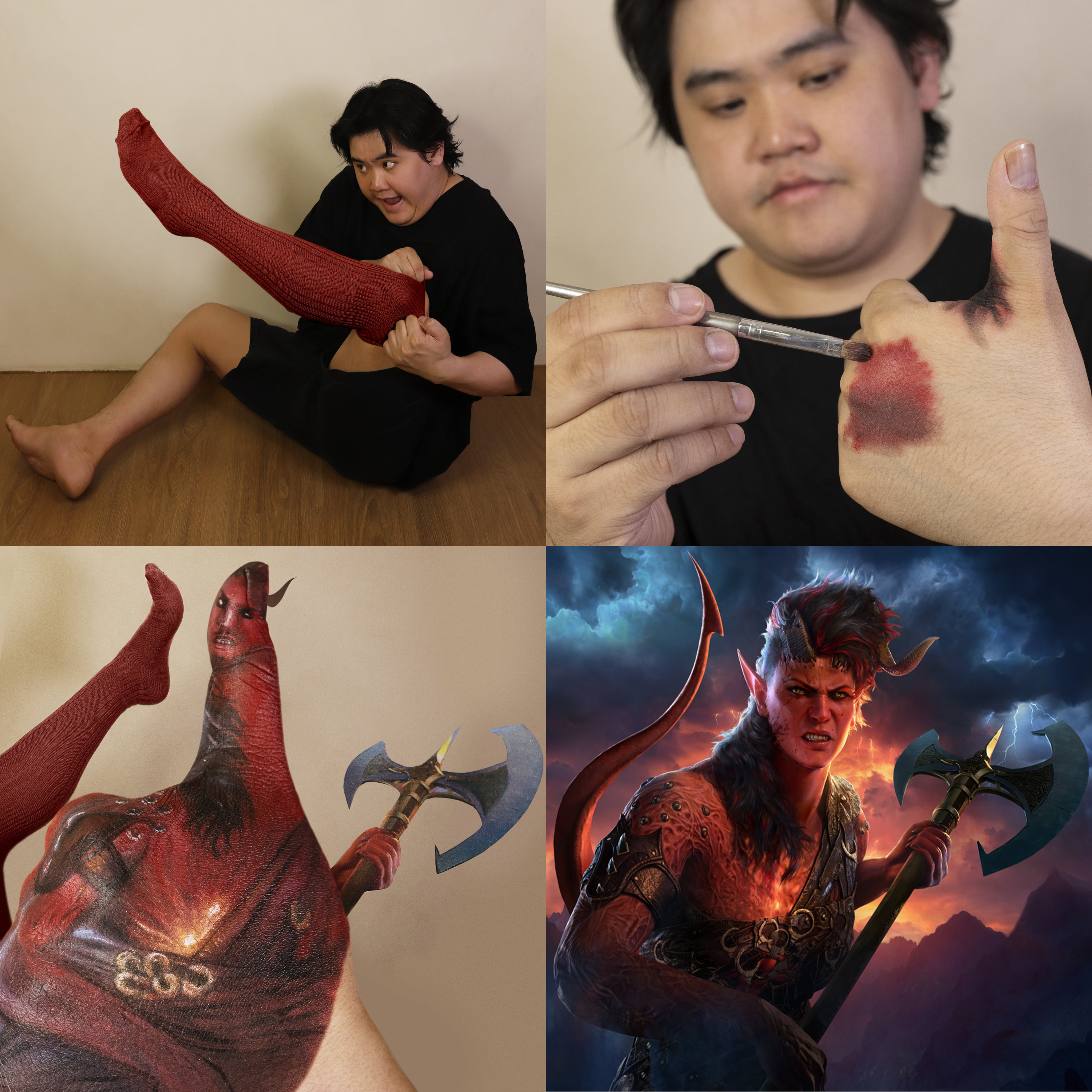 С Карлах пришлось покреативить чуть больше: творец покрасил руку — головой огненной девушки стал выступать большой палец. Роль хвостика исполнила нога в красненьком чулке.
