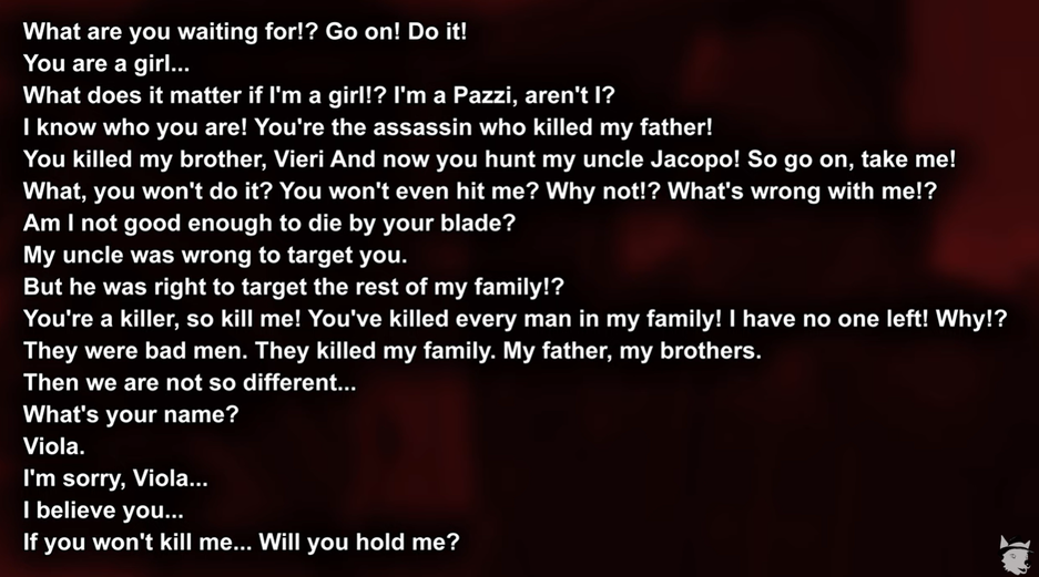 Главный герой, убивший родственников Виолы, объясняет, что семья Пацци не очень хорошая (это заговорщики, причастные к смерти членов семьи Аудиторе), а девушка этому верит и в конце идёт сцена с поцелуем и объятиями.