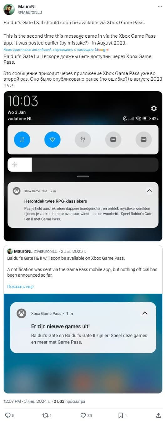 Отраслевой аналитик MauroNL отметил, что, некоторые геймеры получают от приложения сообщение о добавлении в Game Pass первых двух игр серии Baldur's Gate.