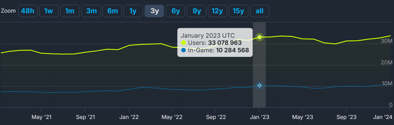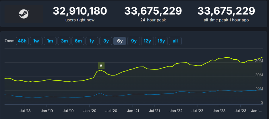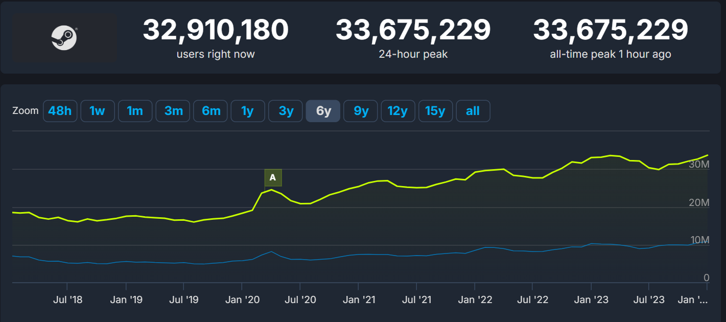 Один из предыдущих рекордов Steam тоже выпал на зимние праздники, тогда счётчик онлайна чуть превышал отметку в 33 миллиона человек, а затем в марте 2023 удалось взять новую высоту — 33.59 млн., этот результат продержался до 7 января 2024 года.