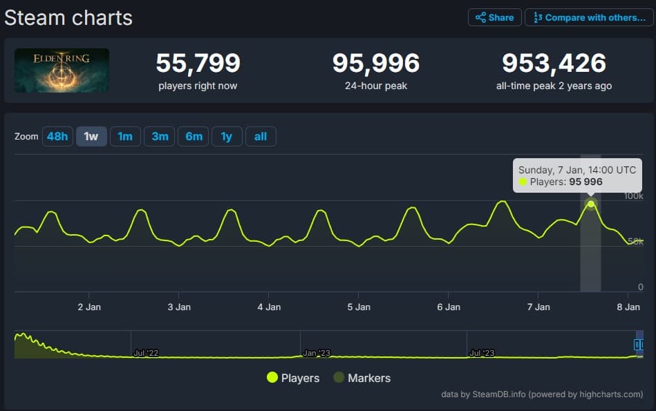 До начала распродажи количество одновременных игроков в Elden Ring составляло не более 30-45 тысяч. Но недавнее снижение цены в сочетании с ожиданием масштабного расширения Shadow of the Erdtree вернуло игру к жизни.