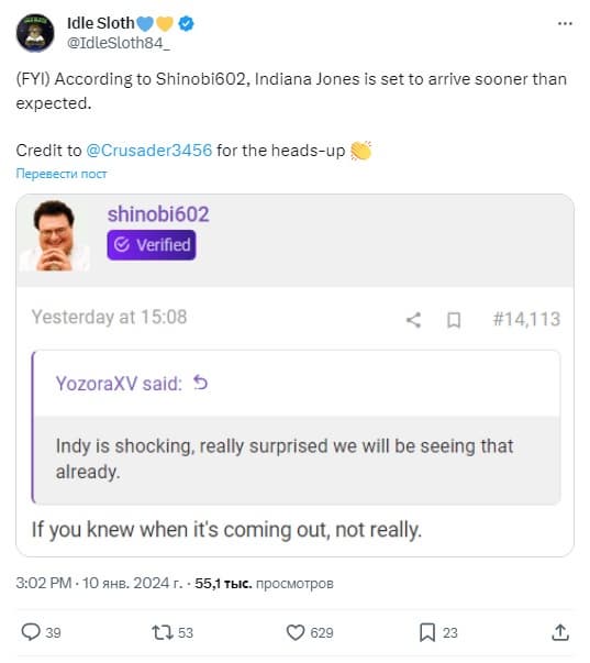 «(FYI) По словам Shinobi602, Индиана Джонс появится раньше, чем ожидалось».