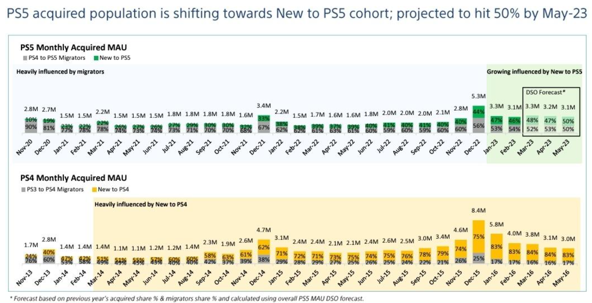 Также появился слайд с прогнозом: предсказывали, что к маю 2023 года доля переходящих с PS4 на PS5 сравняется с числом покупателей-новичков (т.е. многие игроки не переходят, а «приходят», покупая актуальную консоль Sony).