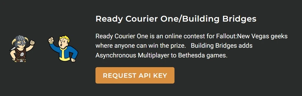 Найти мод Ready Courier One для Fallout New Vegas можно по ссылке, потребуется Nexus Mods API-ключ, получается он тут: https://next.nexusmods.com/settings/api-keys