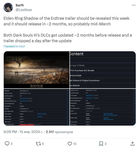 «Трейлер Elden Ring Shadow of the Erdtree должны показать на этой неделе и выйдет дополнение примерно через два месяца, то есть, вероятно, в середине марта. Оба DLC для Dark Souls III обновили за ~2 месяца до релиза, а трейлер вышел на следующий день после обновления».
