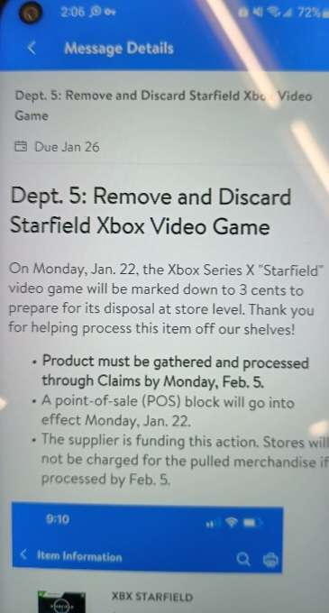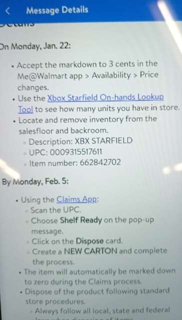 Данную операцию должны завершить до 5 февраля, а затем сотрудники Walmart неким образом их утилизируют (не совсем понятно, отправят ли диски Starfield в помойку или же их уничтожат; снятие с продажи финансирует сам поставщик, магазины штрафовать не будут).