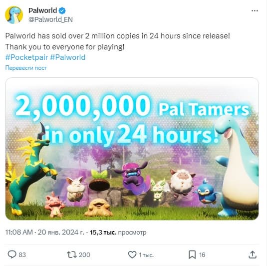 Уже были новости об великолепном запуске Palworld, но вряд ли создатели ждали такой популярности, чем поделились в Twitter.