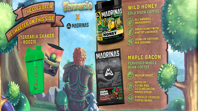 Разработчики Terraria объявили о новом промо. Они снова устроили коллаб с магазином Madrinas, распространяющим энергетические напитки и кофе.