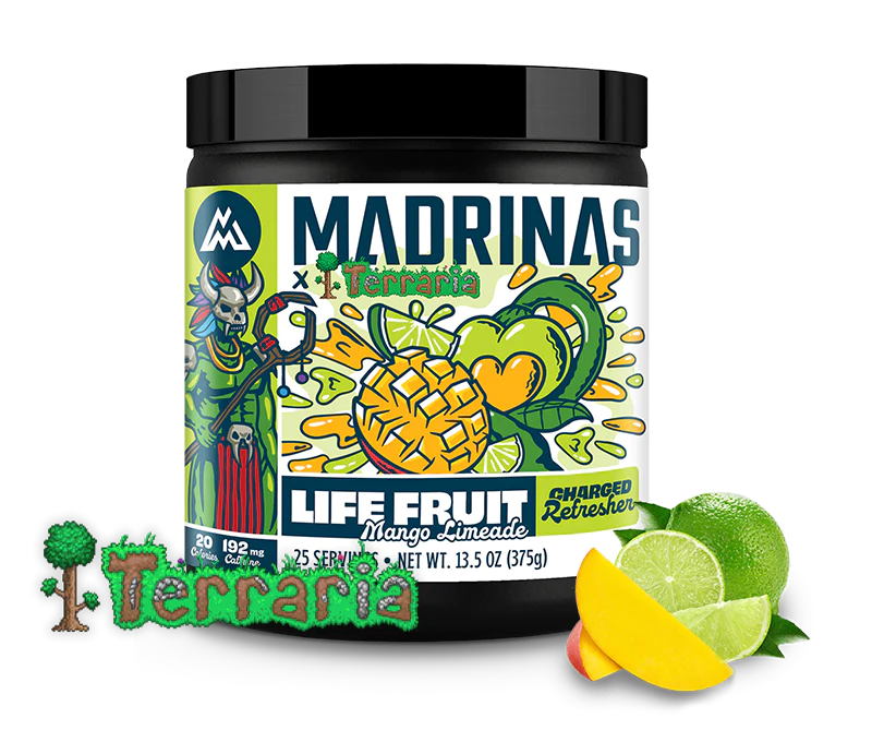 Результатом коллаба Terraria x Madrinas стал энергетический напиток Life Fruit со вкусом манго-лайм. Банку на 25 порций (375 грамм) оценили в $24.99.