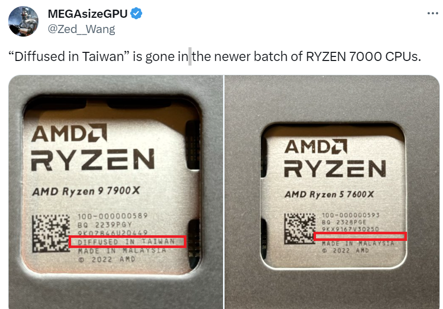 «В 2023 году AMD убрала маркировку страны [где изготовили кристалл] со всех новых процессоров и APU, чтобы привести в соответствие с процессом маркировки других наших продуктов».