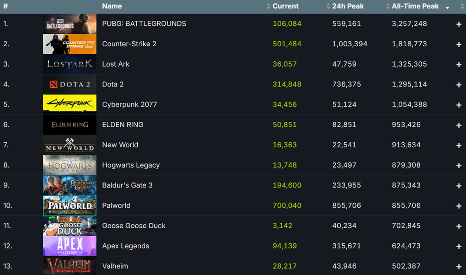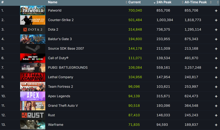 В определённый момент Palworld обогнала по онлайну в Steam условно-бесплатные Dota 2 и Counter-Strike 2 (не по рекордному).