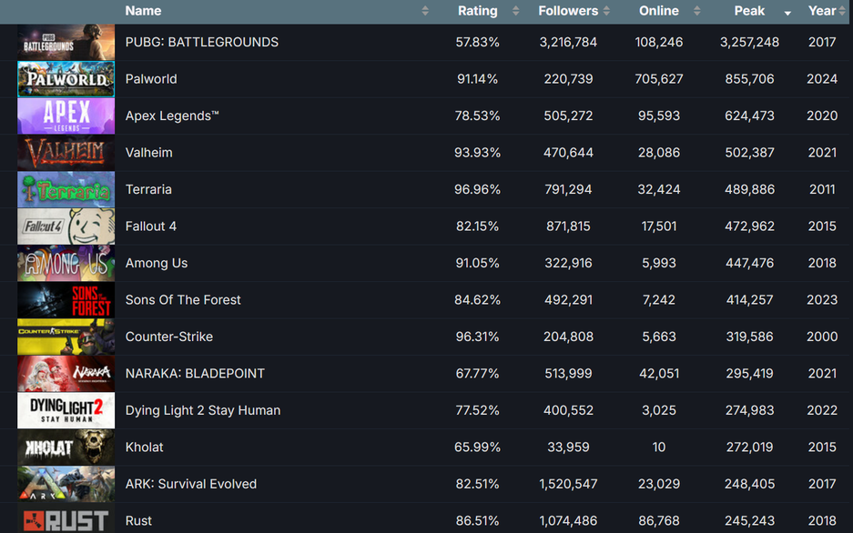 Статистика по тегу Survival (Выживание) выглядит следующим образом. У Palworld второе место, или даже первое — если не считать королевскую битву PUBG игрой-выживанием.