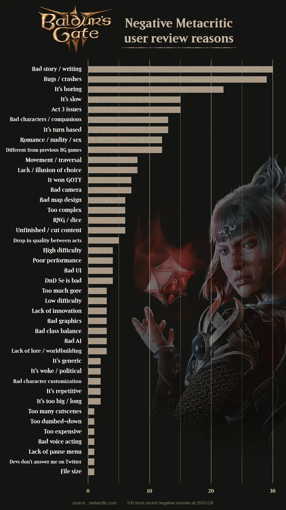 Фанат Baldur’s Gate 3 проанализировал обзоры игры на Metacritic. Он сосредоточился именно на негативных обзорах, составил график частоты упоминаний различных проблем.
